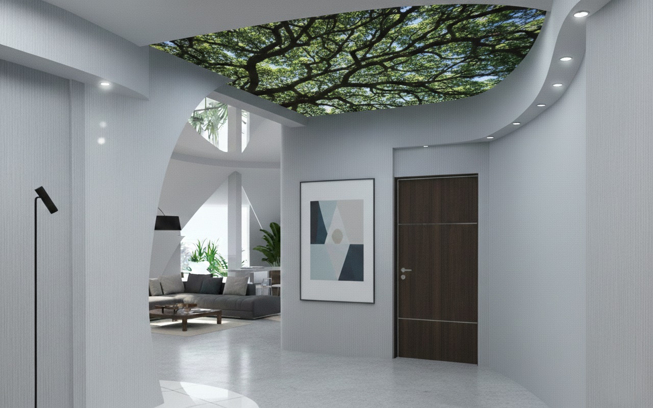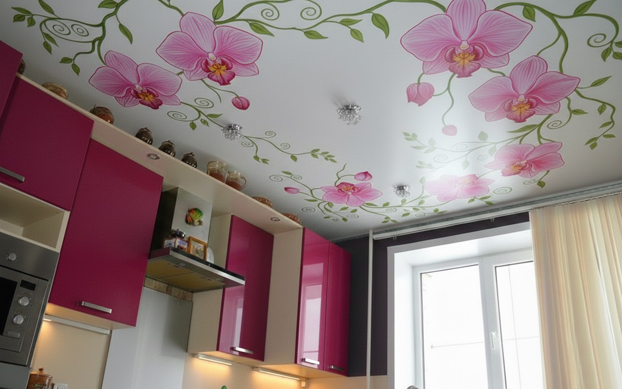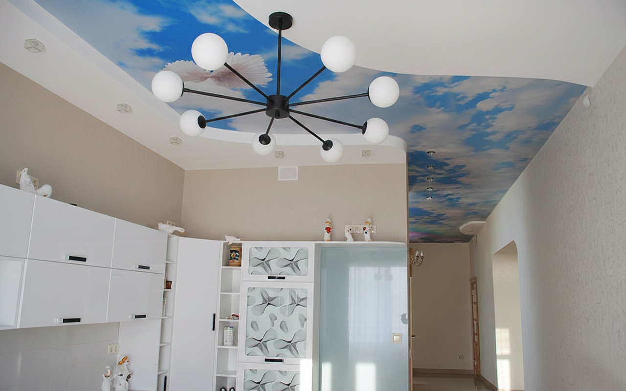 Помимо базовой цветовой вариативности, современные технологии позволяют существенно обогатить арсенал выразительных средств дизайна интерьера, применив натяжные потолки с фотопечатью. Технология доступна: как для тканевых полотнищ, так и для более бюджетного варианта из ПВХ.