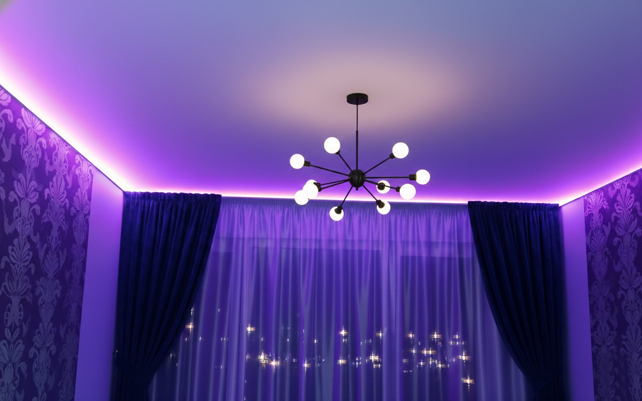 Светодиодная подсветка на натяжном потолке гармонично вписывается в интерьеры типа хай-тек, модерн и даже классика. Монтаж лент с желтым, или теплым белым светом позволяет добиться уникального дизайна. Для любителей менять настроение предусмотрены RGB-ленты, изменяющие оттенок света.