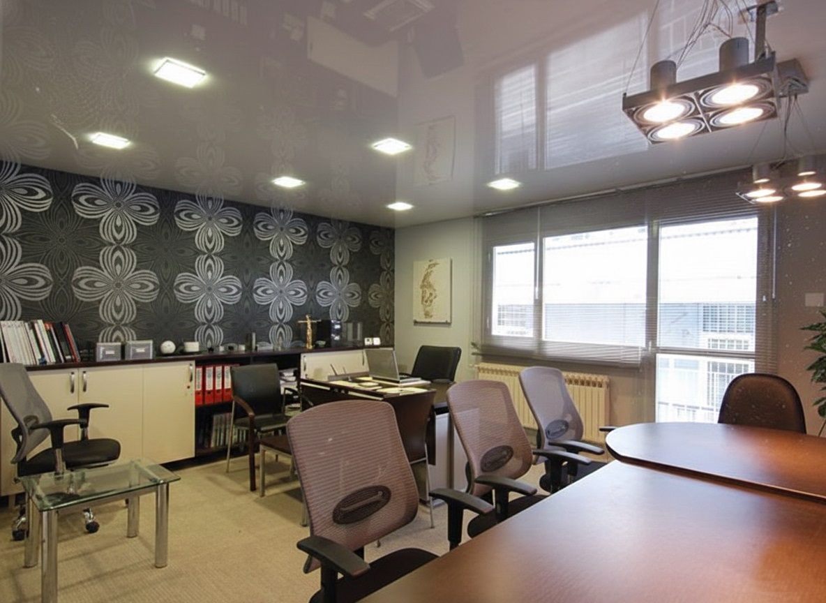 Натяжной потолок для офисного помещения - это обычно конструкция с очень строгим стилем и минимальным количеством дополнительных украшений или сложных осветительных приборов. Главными требованиями к офисным потолкам являются:
